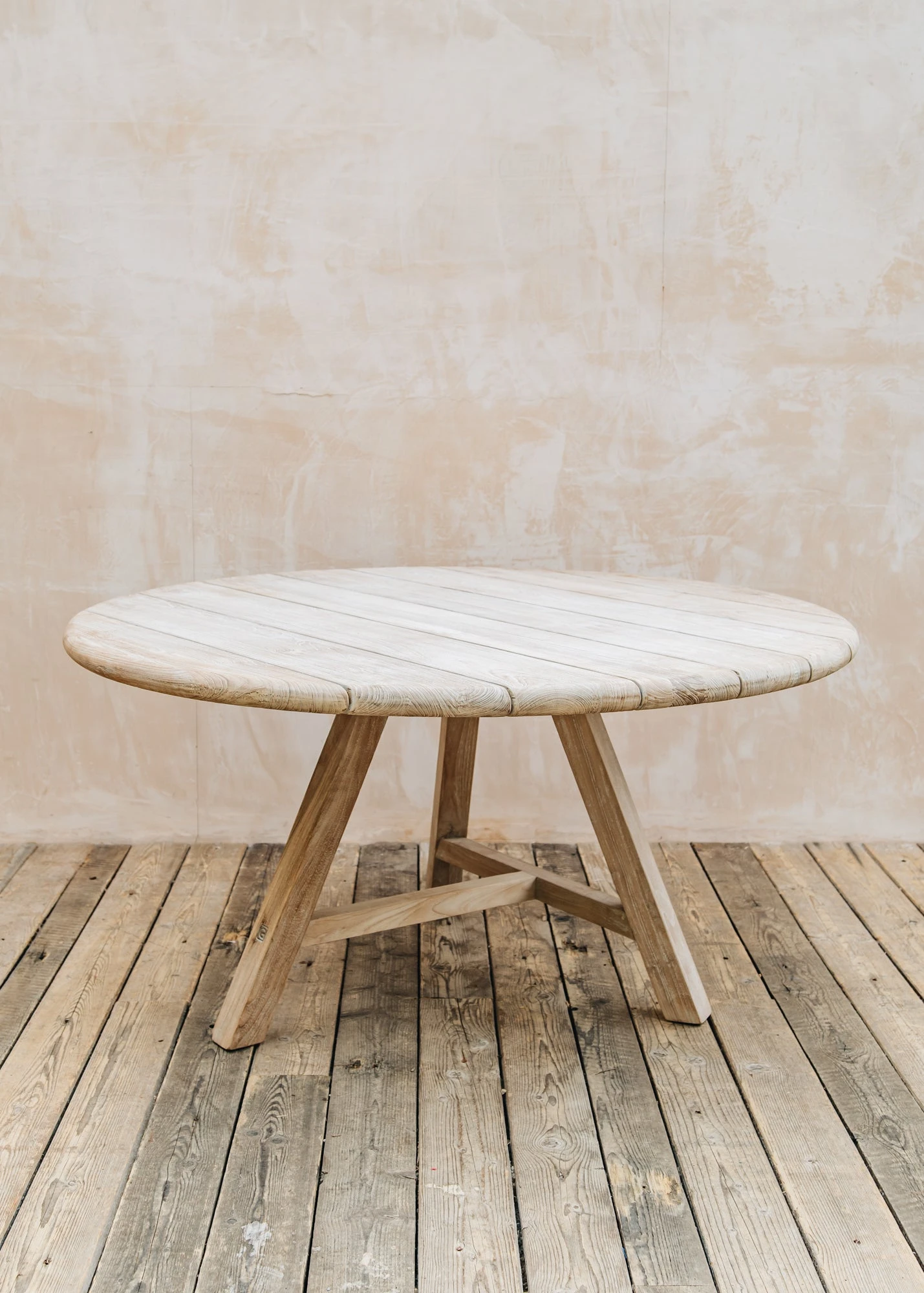 Made from reclaimed teak, each of these Anton Teak Round Tables is unique, revealing its own charismatic figure in the grain of the wood. The subtle tone of the untreated teak will become even more beautiful as it will continue to mellow over time into a more silvery shade.