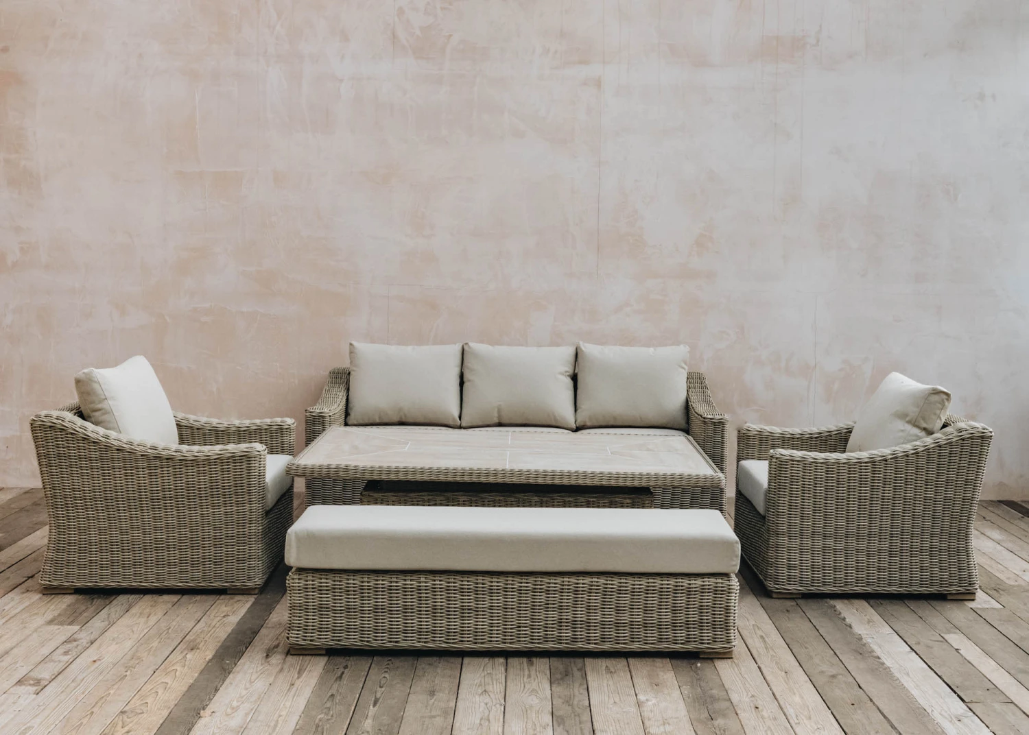 Designed exclusively for us, the Barley Three Seater Sofa Set consists of a three seater sofa with a dual height rectangular table, two sofa chairs, and a dining bench. With enough room for seven, the adjustable table can easily take you from a well-attended coffee morning, to a relaxed summer barbeque. Please note, the featured accessories are not included. Requires some assembly.