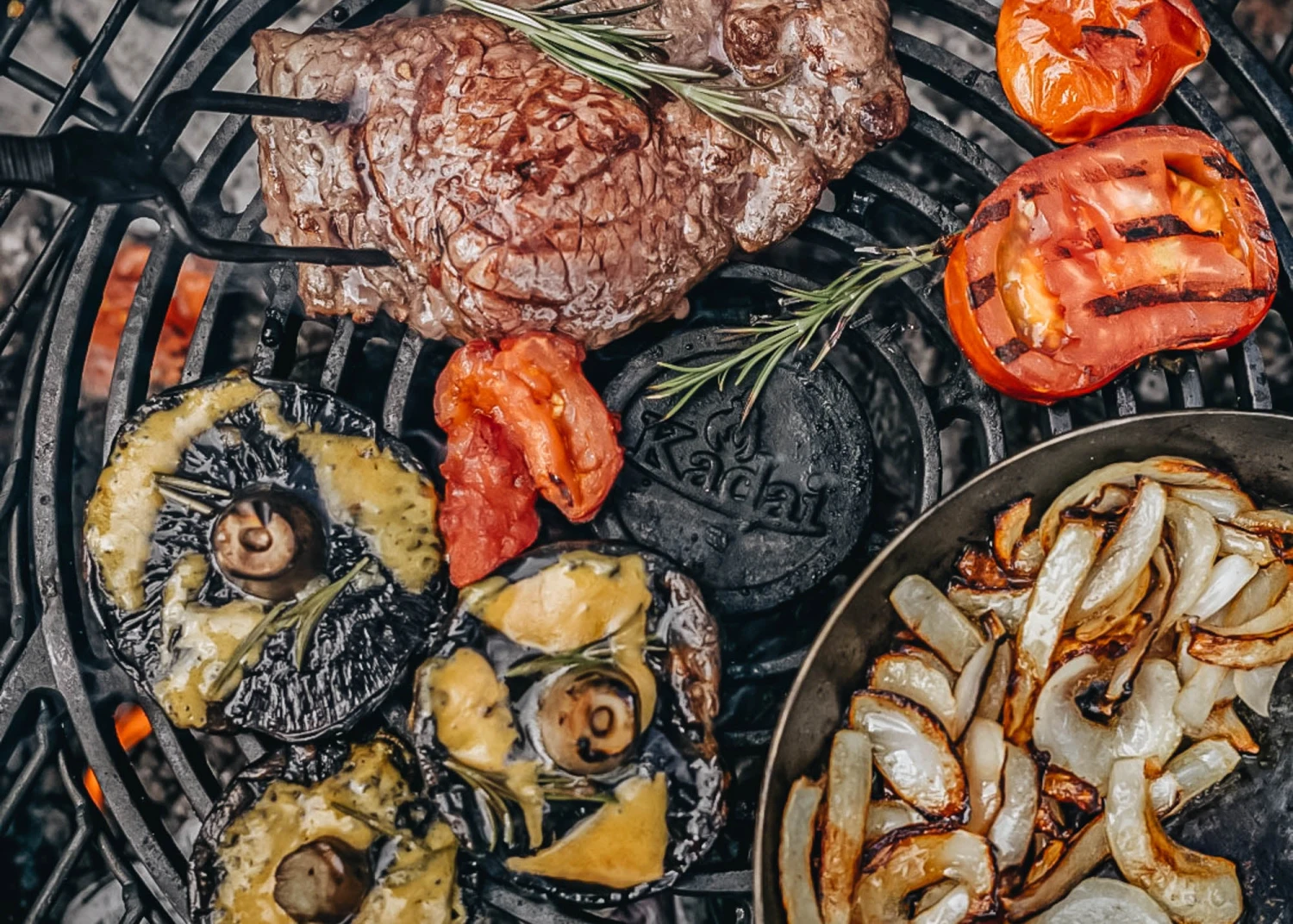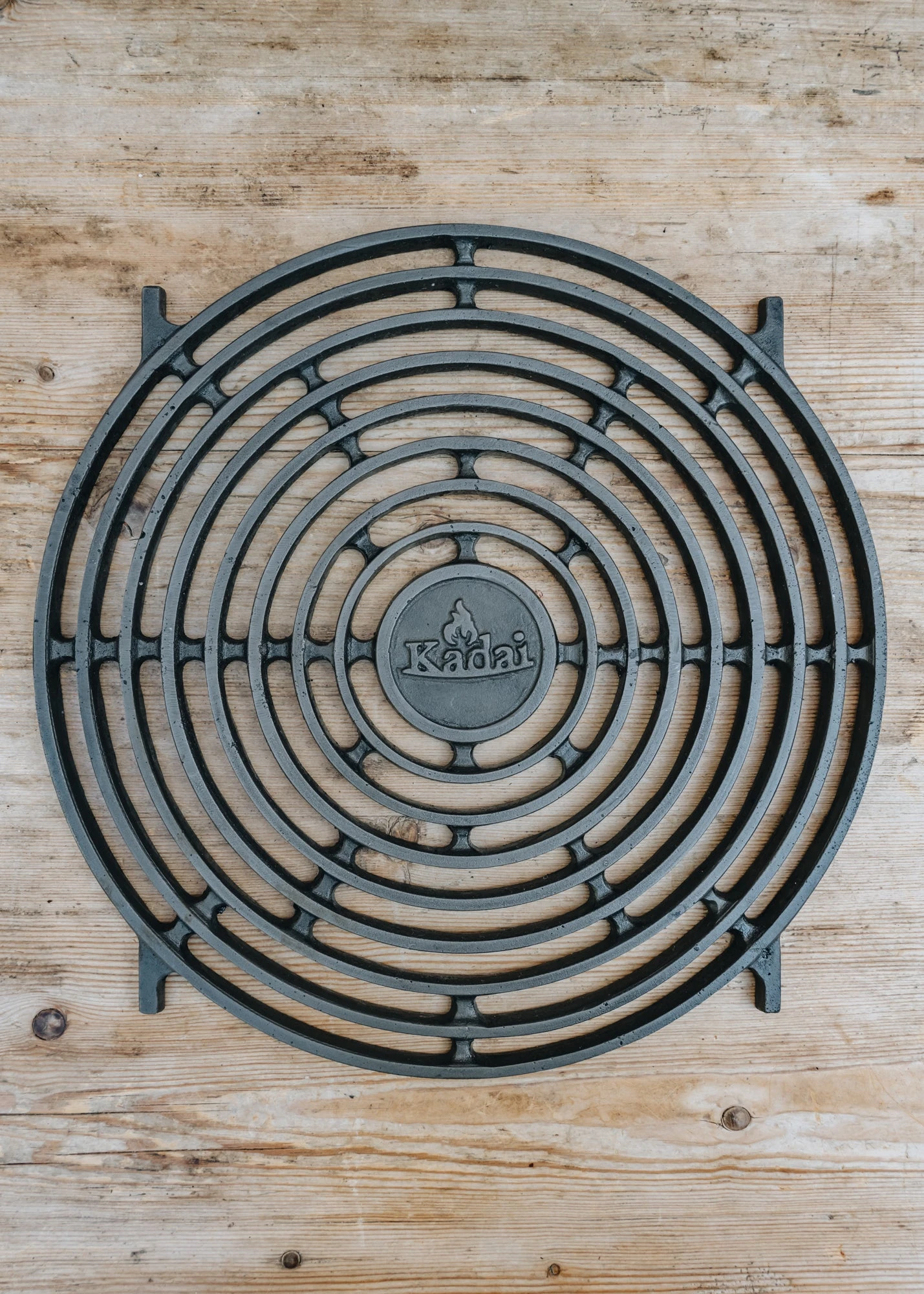 Suitable for firepits up to 80cm diameter, this cast iron griddle fits neatly in the ‘Holi’ grill to allow steaks, vegetables and fish to cook evenly and cleanly over the fire. Cast iron has the ability to get very hot quickly and retain its heat, the high temperature ideal for searing flavour into the food. After supper, the grill can be removed easily for cleaning, and with care, should last for years to come. Some images courtesy of Kadai.