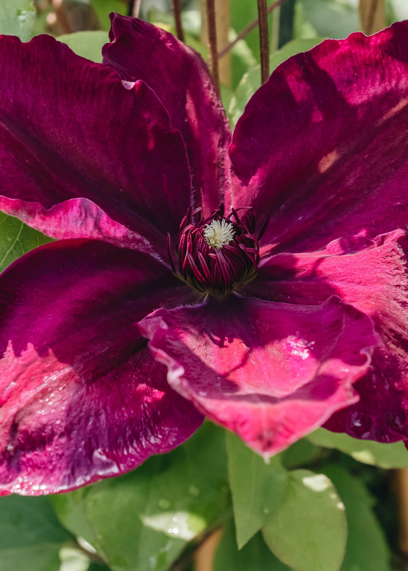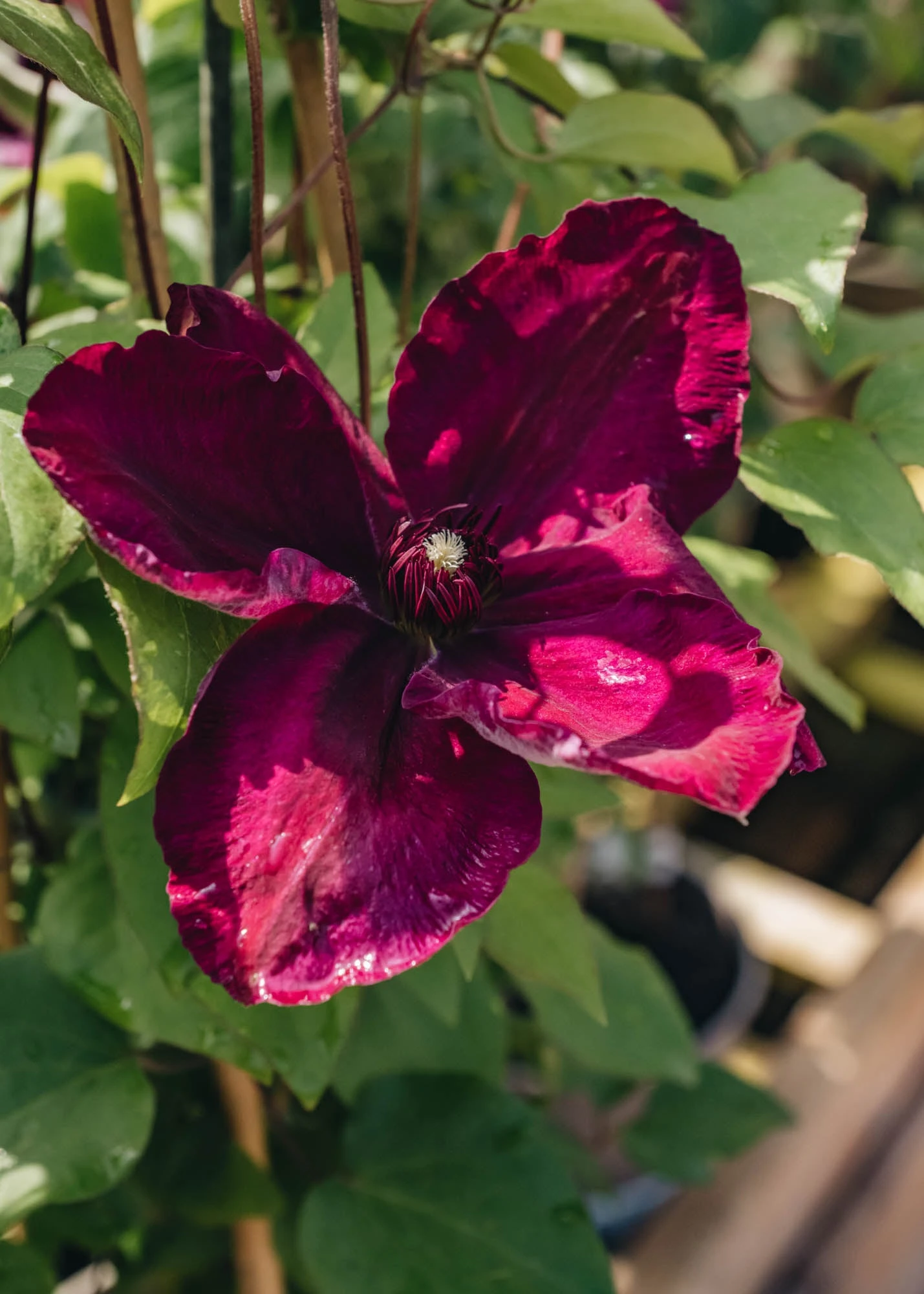 Bearing large, single, deep red velvety flowers in early summer, Clematis ‘Westerplatte’ is sometimes followed by a second flush of flowers in late summer. Mature blossoms have brighter red stamens, taking on a blue tinted edges later in the season. Raised by Brother Stefan Franczak of Poland, it was named in honour of the heroic stand by the Polish First Armoured Brigade stationed on the peninsular of Westerplatte in Gdansk Bay during WWII.