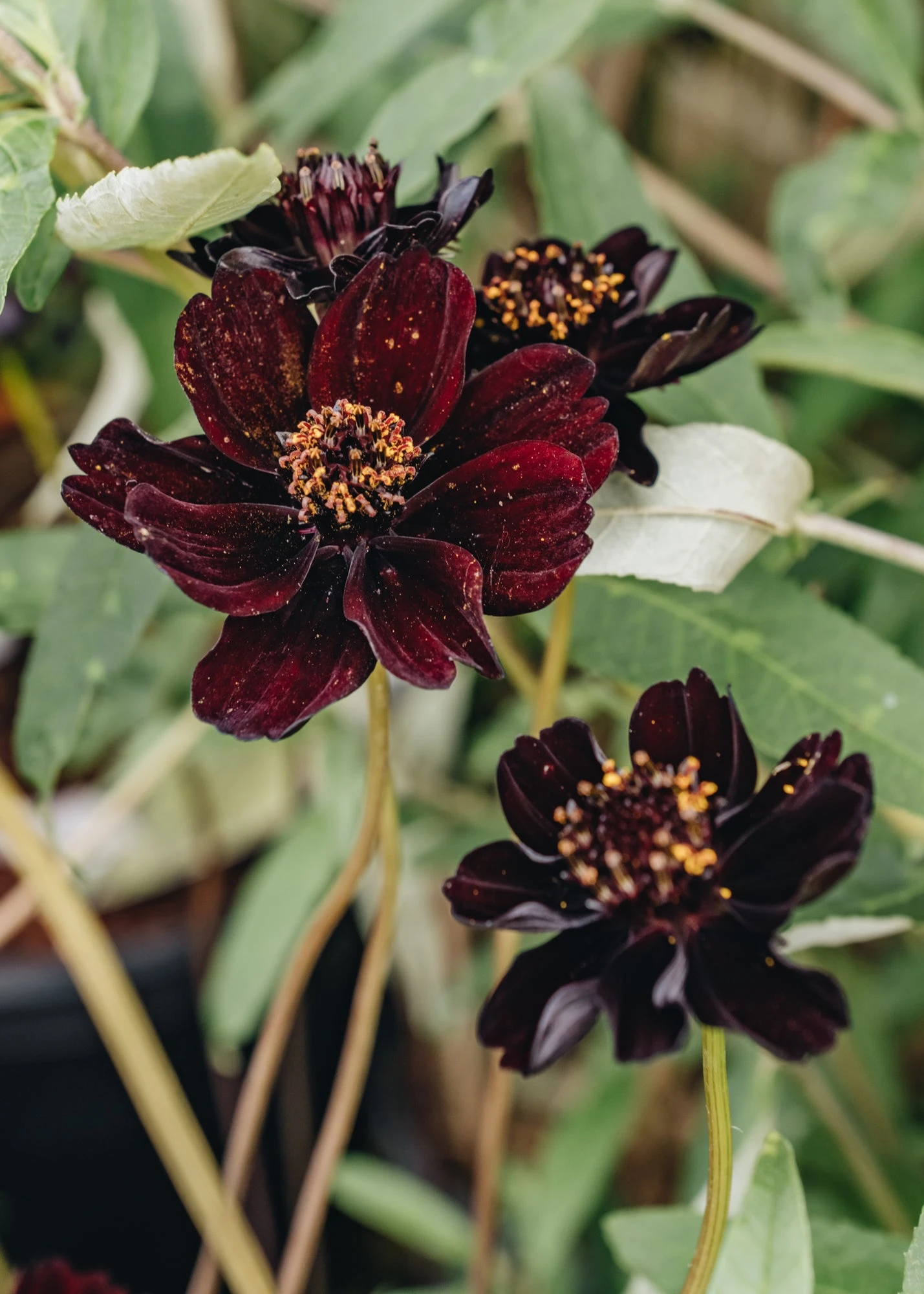 Cosmos atrosanguineus has velvety bronze flowers that are attractive to butterflies and bees. Cosmos are excellent for cutting and ideal for beds, borders and especially containers, where the blue-green lance-like foliage, not to mention its chocolate scent, are striking.