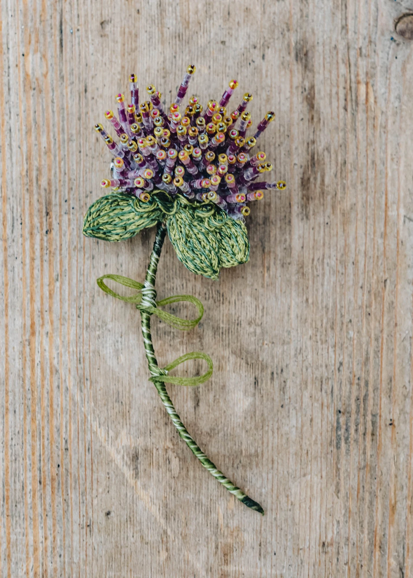 Inspired by natural textures and colours, this Globe Amaranth Brooch is designed to add a touch of vibrancy to any garment. The brooch is exquisitely hand-embroidered and encrusted with metal and glass beads to catch the light.