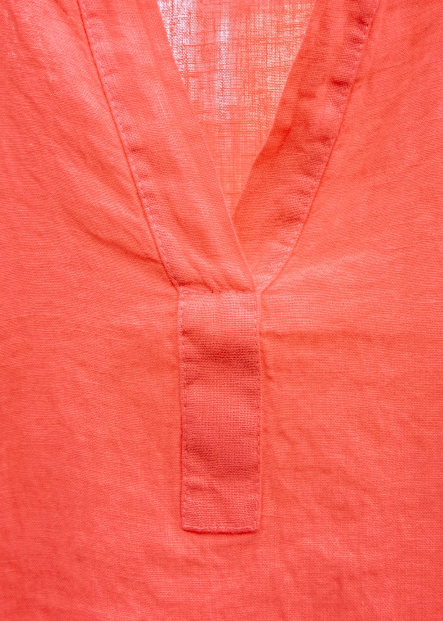 With a modern, loose fit, this Grandad shirt, in fuchsia red, features three quarter sleeves, a neat V neck with band collar and hi-low hemline with side splits. Lightweight and airy, this soft linen shirt offers volume and comfort, ideal for lazy summer days.
