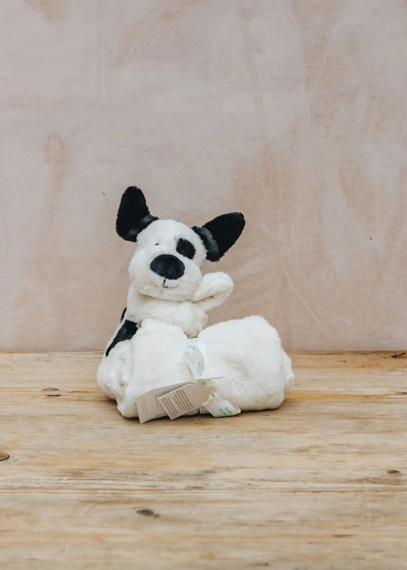 This black and cream Bashful Puppy Soother is the perfect washable present for a newborn or little one. The small, soft plush puppy has wonderful black ears for tiny fingers to grip, and holds a square, unfilled soother made of the softest plush. Presented rolled up and tied with grosgrain ribbon.