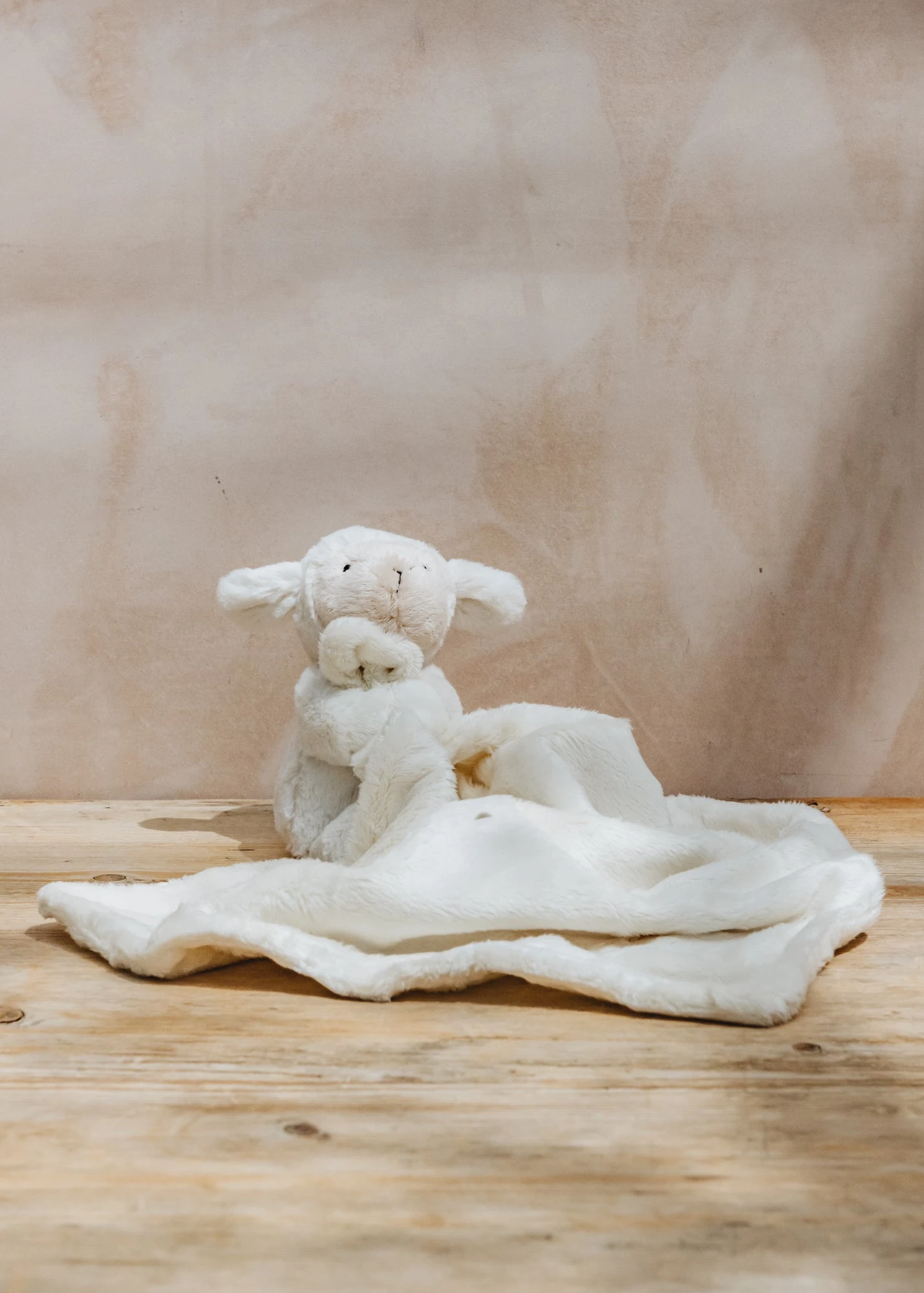 This cream Bashful Lamb Soother is the perfect washable present for a newborn or little one. The small, soft plush lamb holds a square, unfilled soother made of the softest plush, tactile and easy for little fingers to hold. Presented rolled up and tied with grosgrain ribbon.