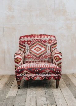 Handcrafted from a Turkish kilim, this lightly padded armchair features a red and grey toned pattern, bearing a distinctive motif. The club style design of the chair allows the kilim to take centre stage, bringing warmth and heritage to a room. With stud detail, saddle arms and tapered wooden feet, this unique chair is elegant and practical, allowing for relaxed yet supportive seating.