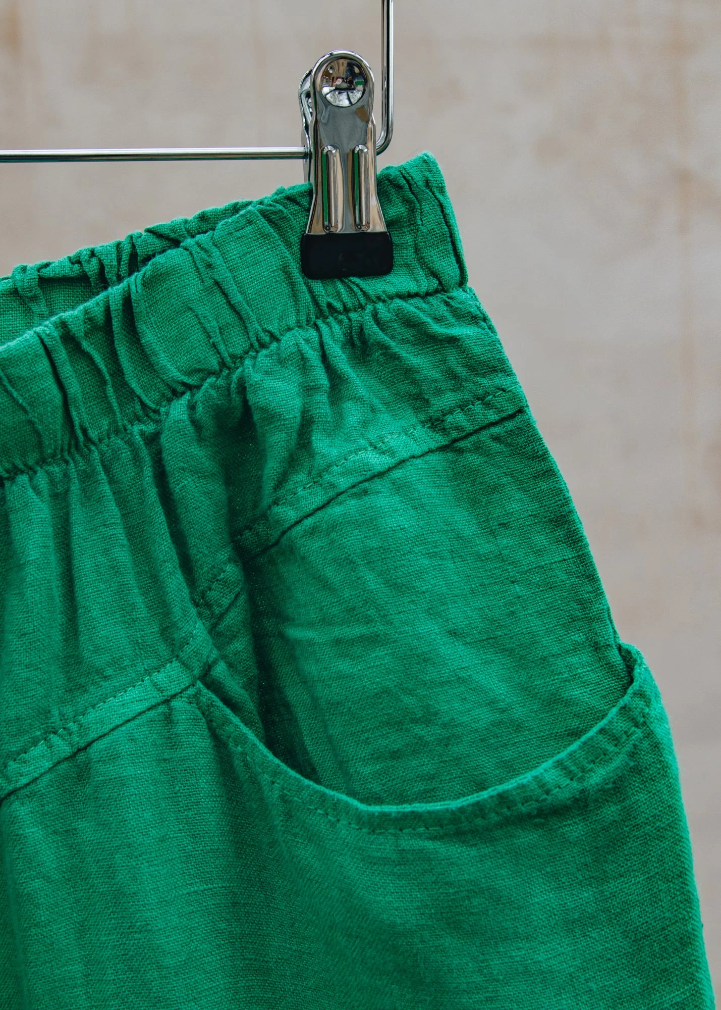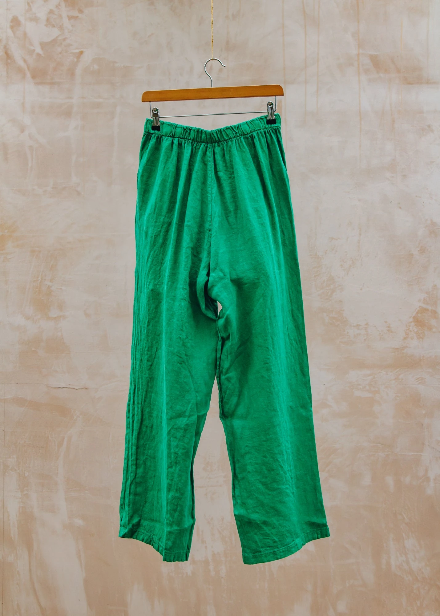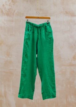 These apple green, easy-fit linen trousers are an ideal wardrobe addition, perfect for popping on in warmer weather. The elasticated waist ensures a comfortable fit, while the long, straight legs and seam detailing add a stylish touch. Lightweight and airy, the soft linen fabric is gentle on the skin, a considered choice for travelling or every day.
