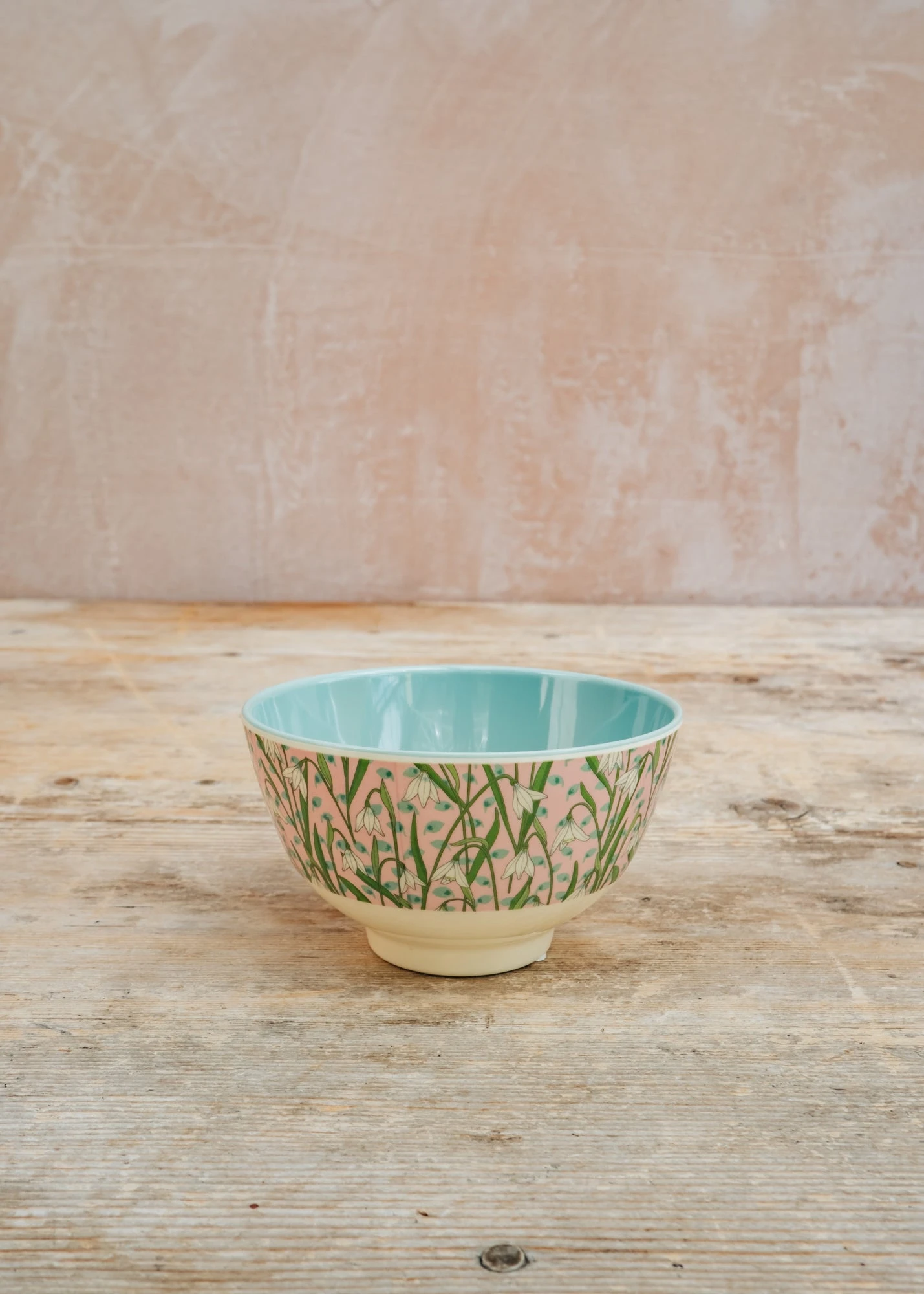 Inspired by early spring blooms, the Small Melamine Bowl in New Snowdrop features gentle nodding snowdrops on a pastel pink base. The soft blue interior completes the look, blending durability with a fresh, floral spirit that suits any table.