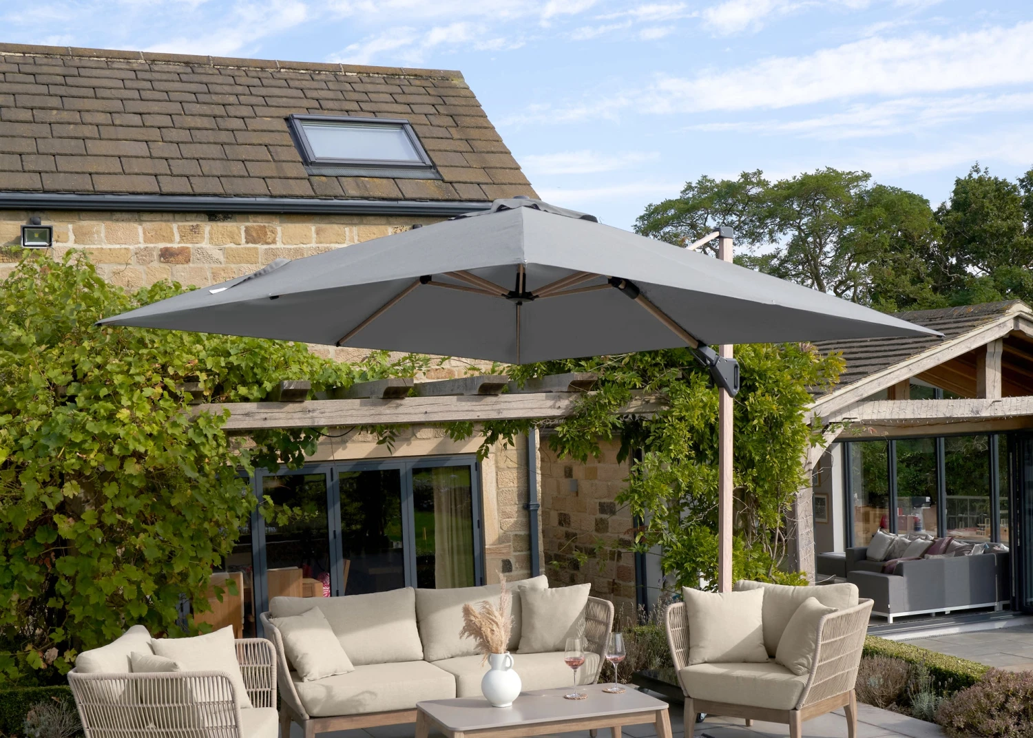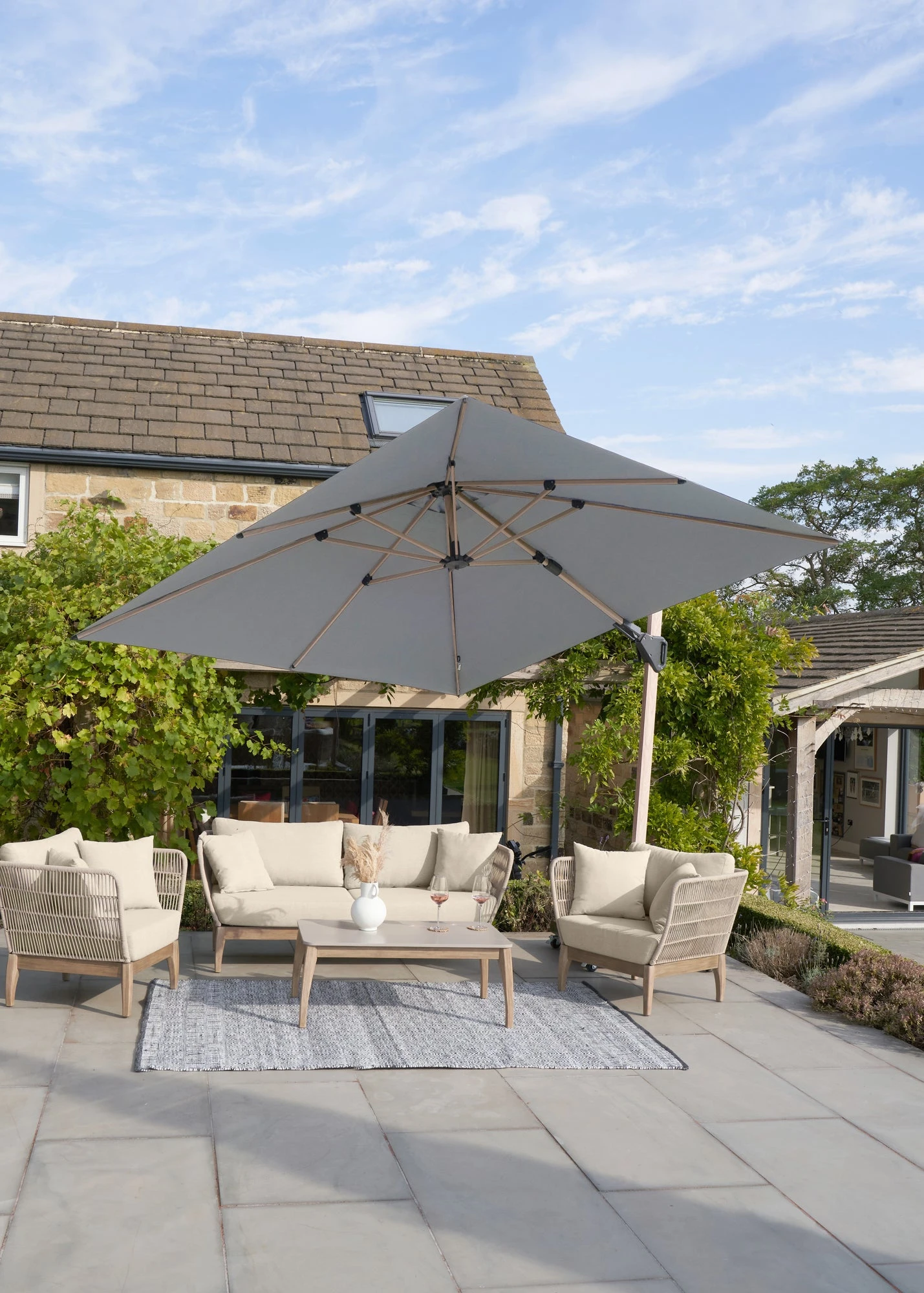 This luxury Square Parasol is perfect for creating protective shade in the garden. The design makes the angle of the parasol very malleable, being able to rotate 360 degrees without moving the base, and tilt backwards and sideways with the aid of the aluminium crank. Please note, the featured base is not included. The bases suitable for this parasol are available to purchase separately at the time of ordering. Images courtesy of Pacific Lifestyle.