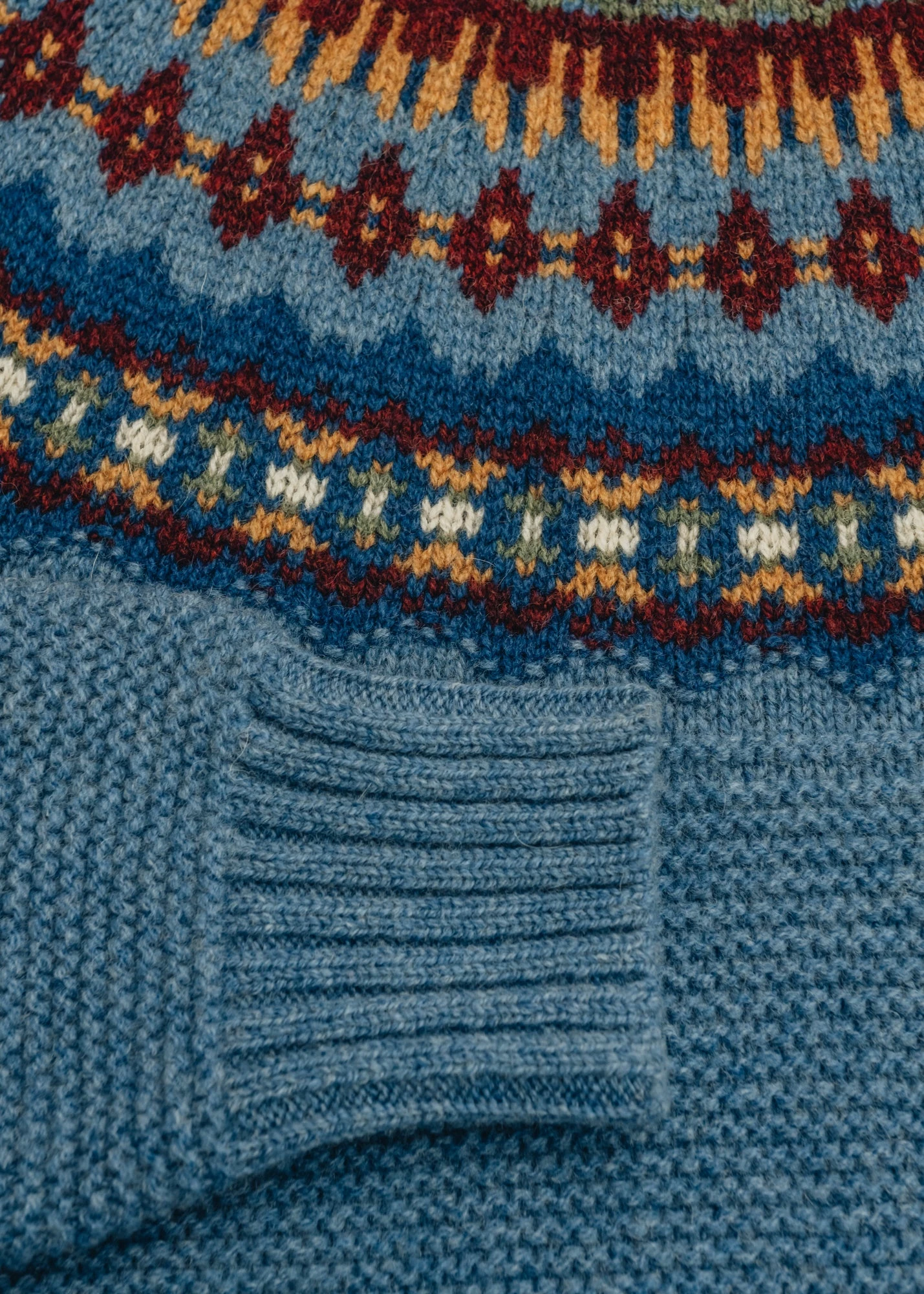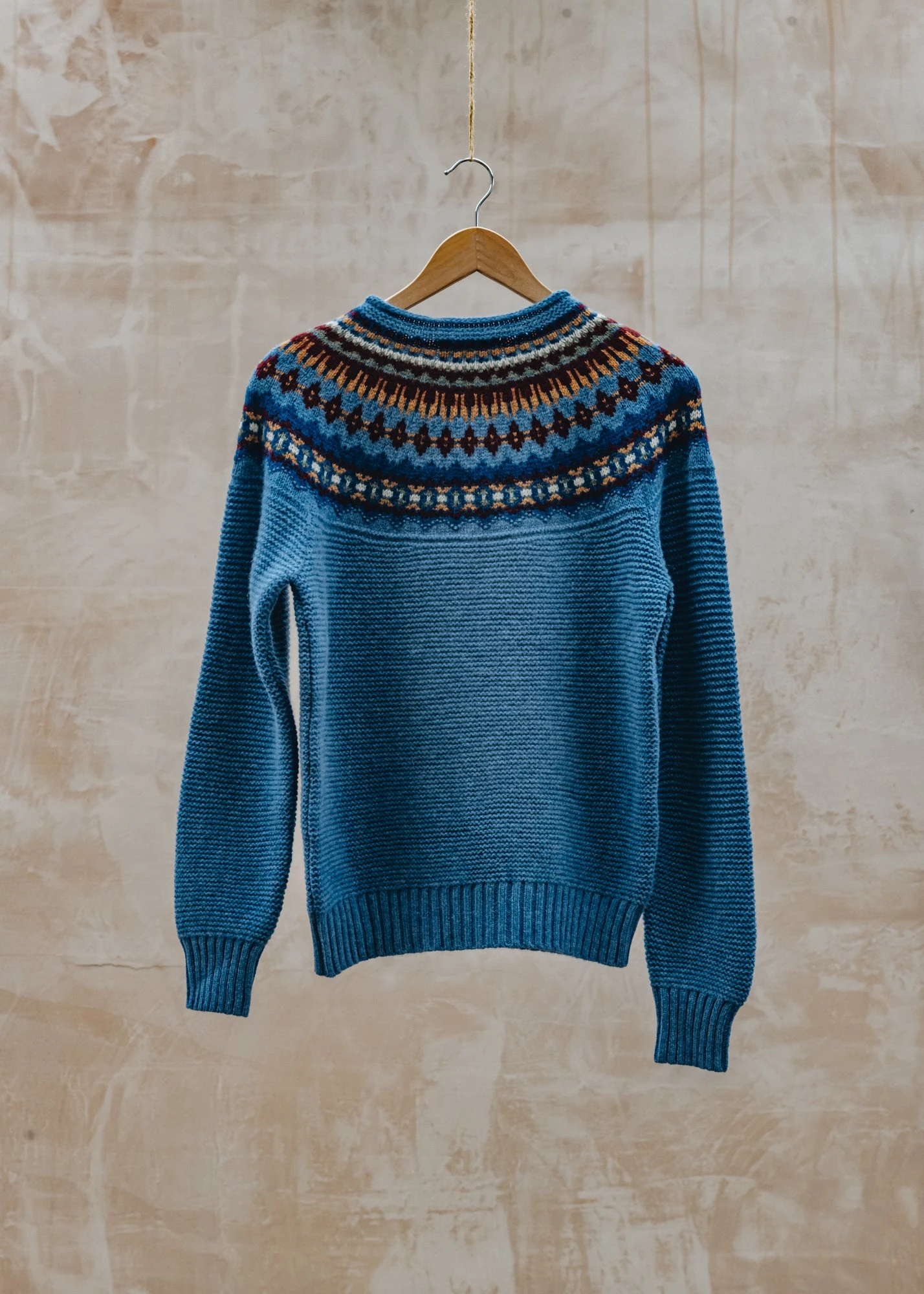 Crafted from 100% Merino wool, this hand-knit style sweater boasts a wonderfully textured feel with a rolled edge round both the neck and rib trims. Decorated with an eye-catching graphic yoke, this charming, loose fitted garment will prove perfect for your autumnal, outdoor pursuits. Surprisingly lightweight, its exceptional warmth will see you safely through to spring.