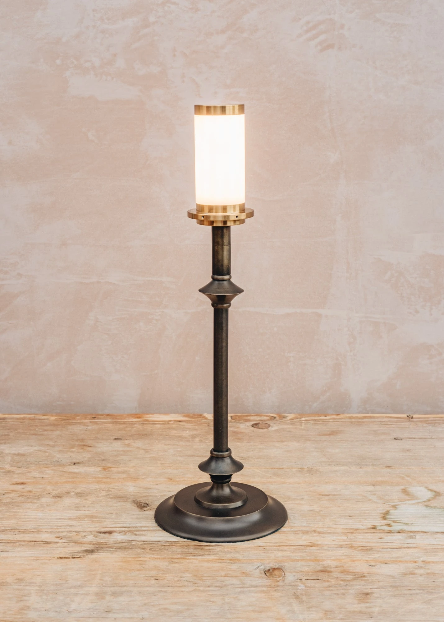 A popular lamp, the Tiny Trindle, with its contemporary bronze lines, is now rechargeable, using a Genesis Cell bulb for up to 15 hours of light. The fact that it does not require an electrical connection affords it great versatility as a portable table lamp, moving seamlessly around the home. A remote control allows easy dimming and a timer, all from the comfort of your seat! Featured shade is not included.