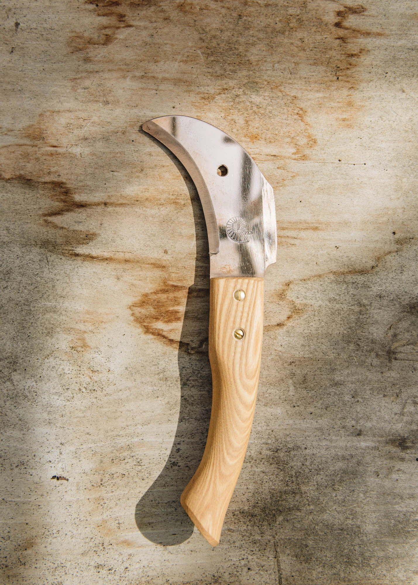 Beautifully shaped and satisfyingly robust, this Herb Sickle is a practical tool for gathering herbs and harvesting salad leaves. The curved blade is sharp on both sides so it can be swung back and forth, cutting both ways. The outer blade is also used for cutting clean scions and notches when grafting.