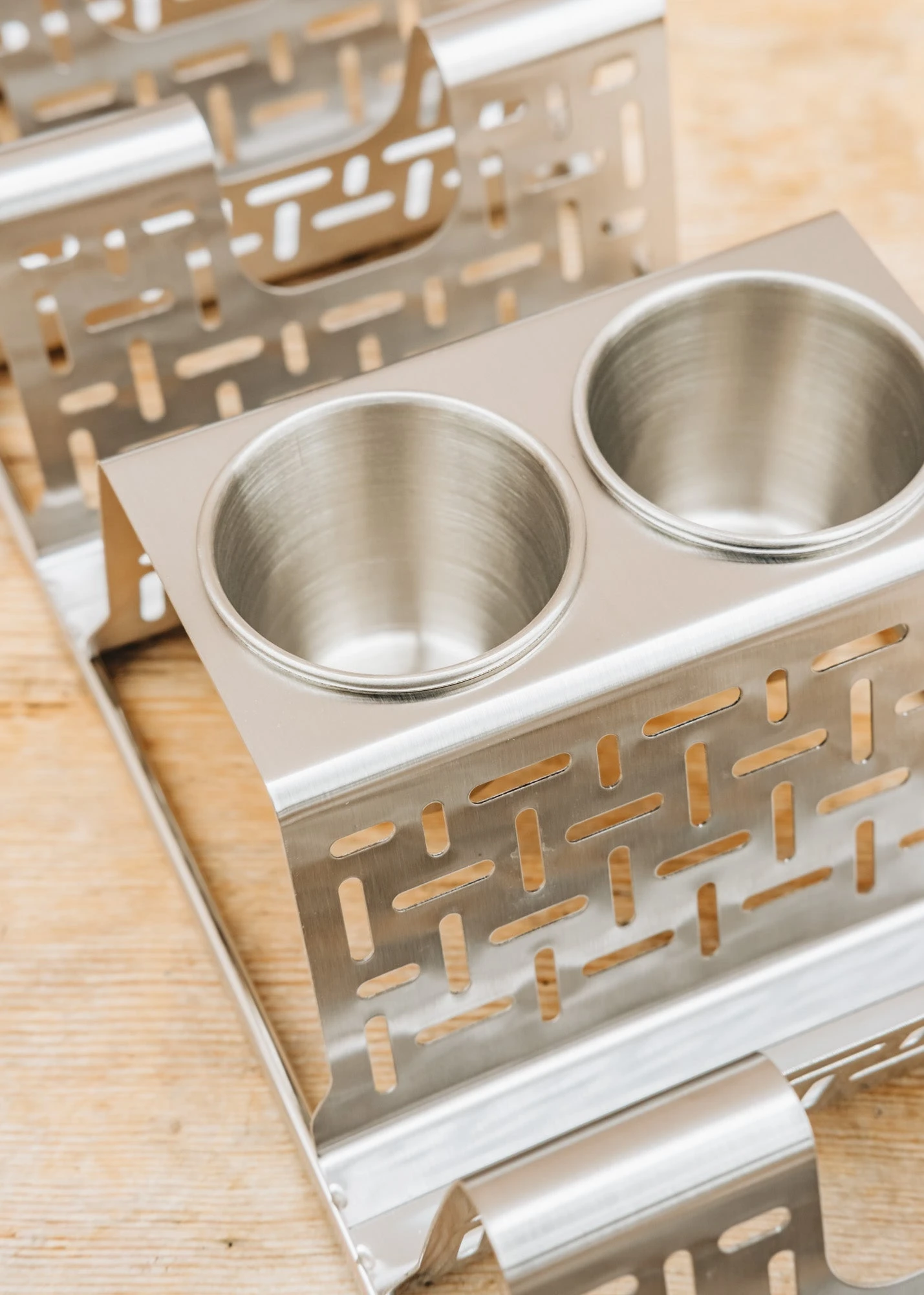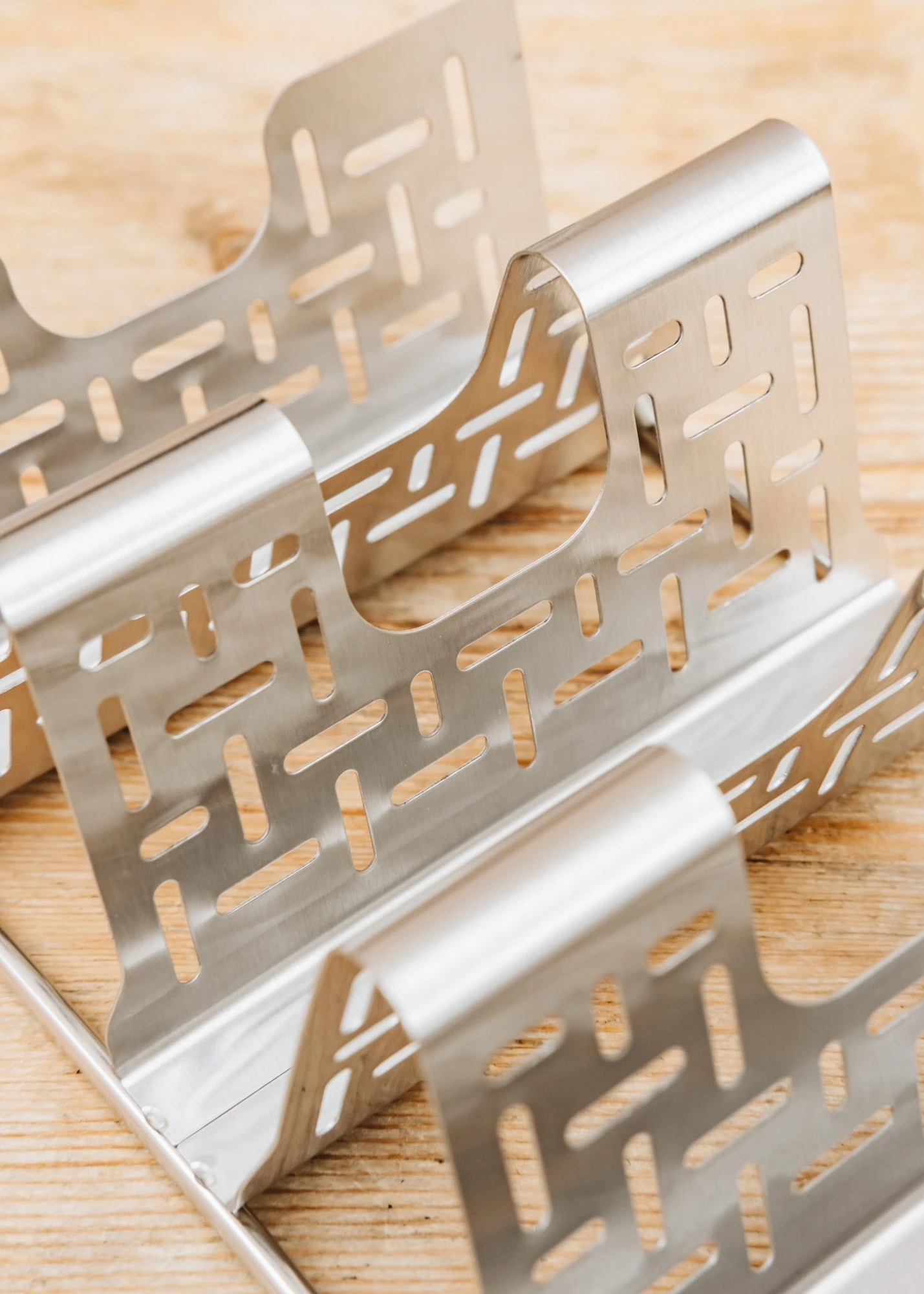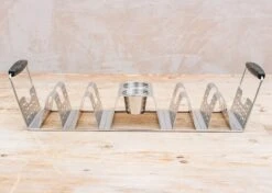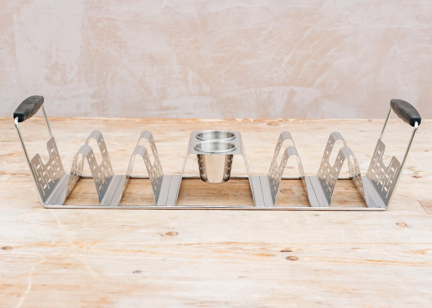 Designed with a sturdy stainless-steel construction, with silicone handles allowing for the safe transportation for the grill to the table, this taco rack will help make everyday a taco day. Boasting two built-in sauce cups to keep your guac and salsa close by, simply let your guests dive in and enjoy.